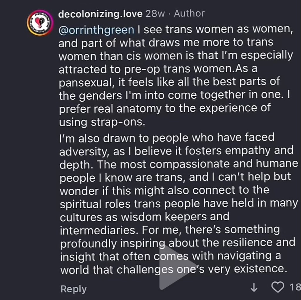 Underneath an Instagram post, Millie, who makes most of the posts for Decolonizing Love, discusses her preference for pre-op transgender women. She says she prefers them over cis women. Her reasons? Trans women with penises could potentially fulfill one of her sexual desires: being fucked by a woman with a functional and responsive penis.