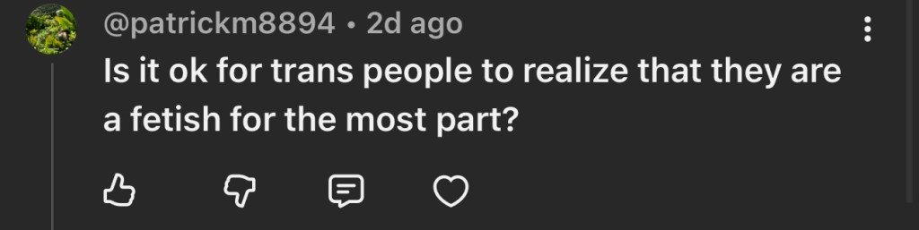 However, in my life, I’ve had multiple long-term relationships. I’ve been in love more than once, and currently as a polyamorous person I have several long-term partners who very much love me and are very much proud to be seen with me. They don’t fetishize me for being transgender, in fact, they didn’t even know that I was trans when we met. What I think people in your position will always struggle to understand. Is that the reality for many transgender women moving through the world is that while plenty of people fetishize us, and plenty of people see us as through stigmatized lens, it’s actually fairly common that when men are attracted to you, and especially if you fall into a certain range of beauty, you will meet men who desire actual relationships with you. Will that be most men? Probably not, but that really doesn’t matter they are men who do and I often think that when people go out of their way to reinforce the idea that trans women only exist within the scope of a fetish, they are often fighting to maintain their access to trans, people by reinforcing and engaging in transphobia that makes trans people more accessible to them because of stigma.